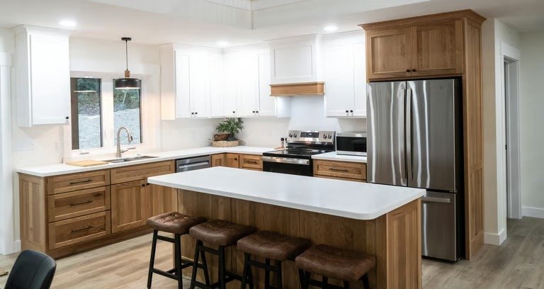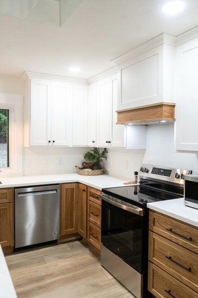 The kitchen is custom built with character white oak cabinets and solid surface countertops. It is furnished with a full sized fridge, stove, microwave, and dishwasher. Enjoy your meals around the table and bar.