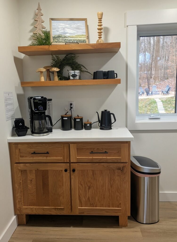 The coffee bar is stocked with a Ninja Dual Brew Pro Coffee Maker. You can make a full pot, single cup, or travel mug of hot or iced coffee. We supply some regular and decaf coffee beans. However, if you have a large group that drinks lots of coffee or you have a preference of coffee, please bring your own. There are individual cups of regular and French Vanilla creamers in the fridge. We also supply tea bags, k-cups, and sugar cubes for your drink needs.